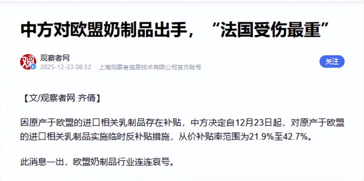 一方面,自从特朗普对欧盟征收30%的普遍关税后,欧盟经济的重头德国汽车产业就对美出口大幅下降。另一方面,为了报复欧盟对我国电动汽车反补贴税,我们也对欧盟进行了各种反制措施。刚刚公布的对欧盟乳制品最高42.7%的关税和对白兰地34.9%的关税就是最新的表现。其中白兰地最为明确,就是为了打击法国在电动汽车上的保护主义立场。