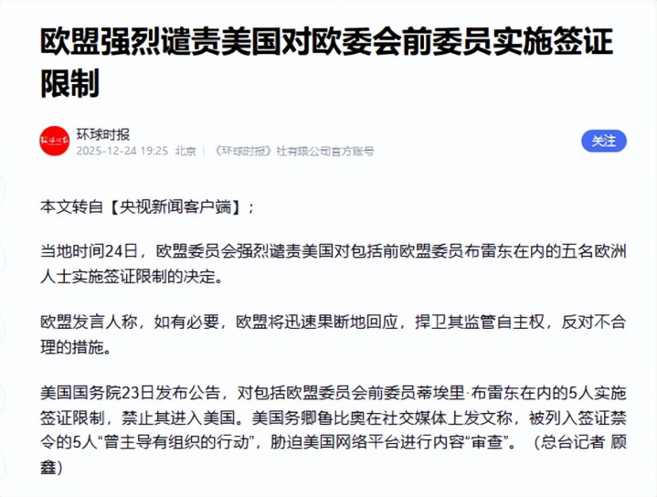 当然,这种做法必然会引发特朗普政府的高度不满。就在最近,美国国务院就宣布对五名欧洲人禁止入境,其中就包括前欧盟内部市场专员。