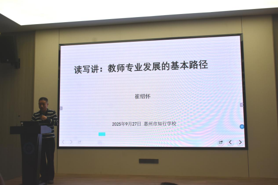 专委会副主任、惠州分会负责人崔绍怀教授则以《读写讲:教师专业发展的基本路径》分享个人经验。他结合 16 年初高中语文教学实践,强调教师要找准专业“兴趣点”,通过大量阅读积累、反复打磨公开课、深耕课题研究、撰写教学论文等途径,实现从“站稳讲台”到“站好讲台”的跨越。他鼓励教师聚焦核心领域深耕细作,形成个人教学特色,让专业成长之路走得更稳、更远。
