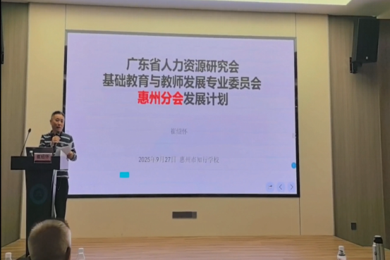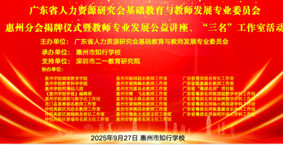 金秋时节,丹桂飘香。2025 年9月27日,广东省人力资源研究会基础教育与教师发展专业委员会惠州分会(下称“惠州分会”)揭牌仪式暨教师专业发展公益讲座、“三名”工作室活动在惠州市知行学校顺利举行。